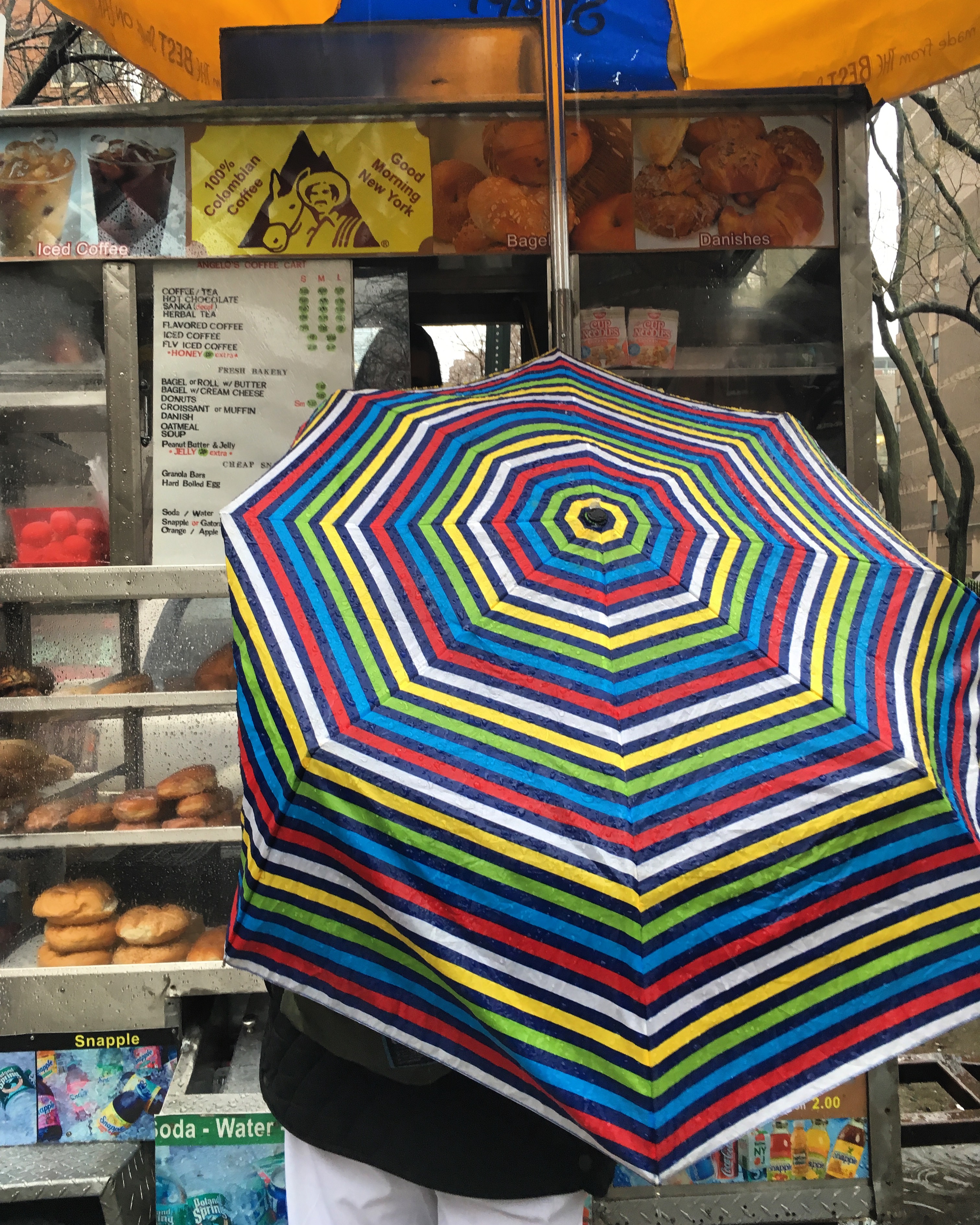 Caffeine Fix #umbrellacarnage #umbrella #nyc #winterstormriley #wintrymix #rainbow #stripes #stripedumbrella #coffeecart #caffeinefix #streetvendor @streetvendorproject #friyay